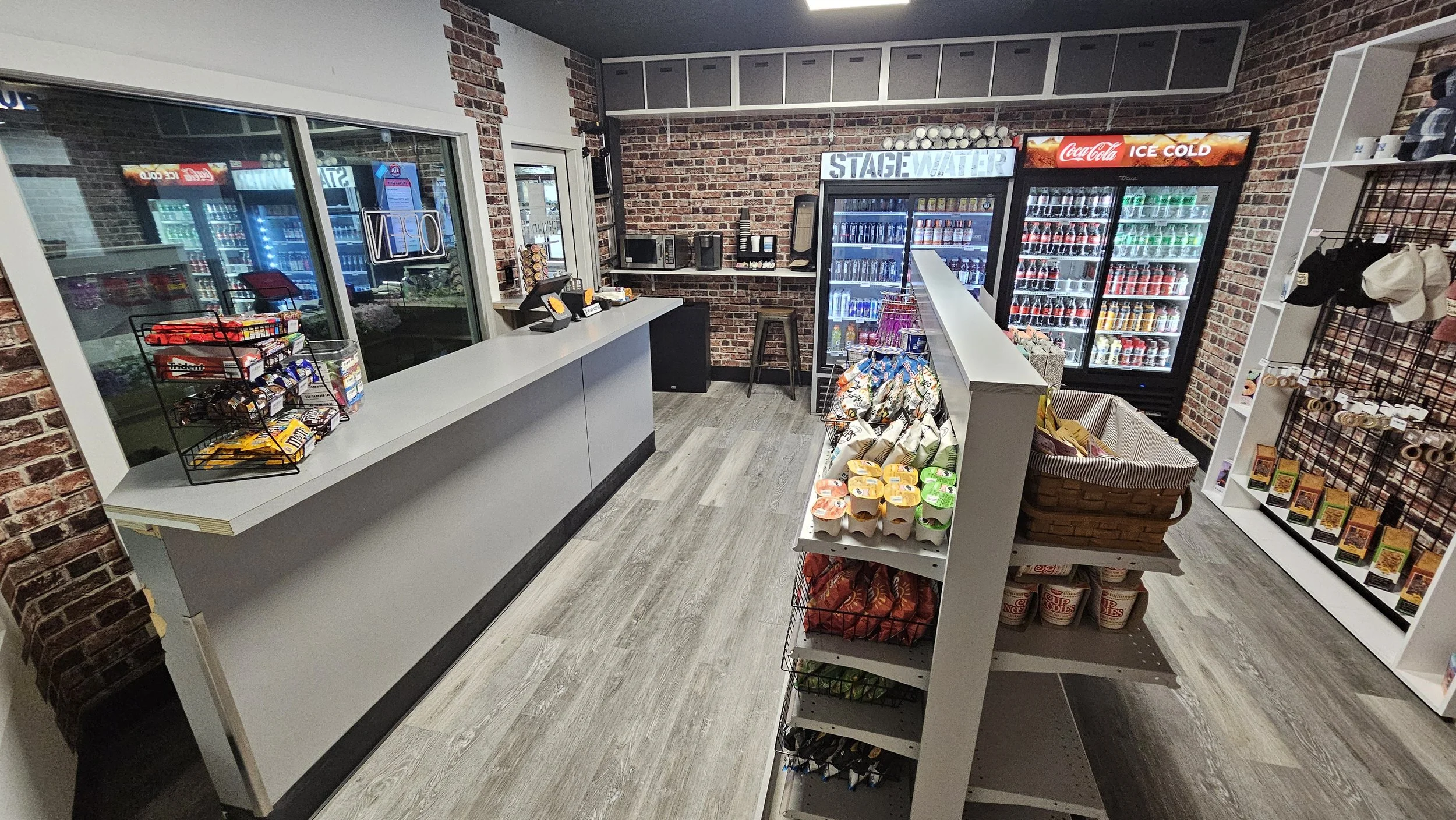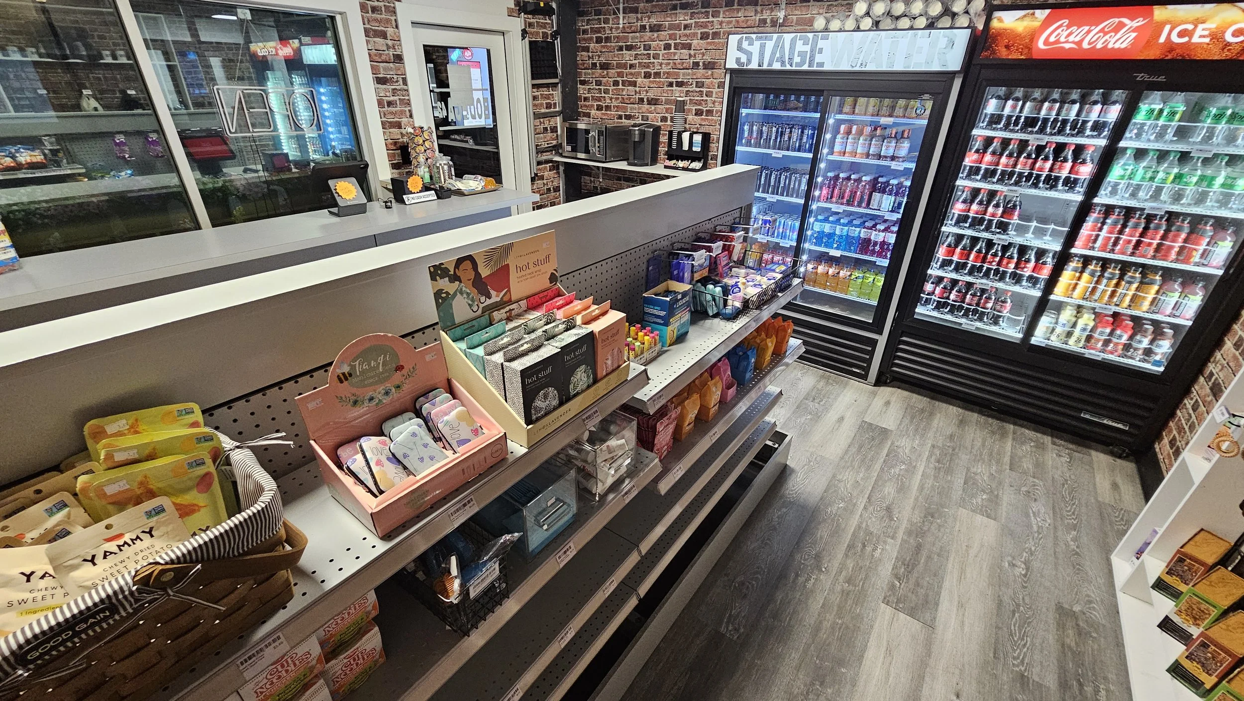 - Stocked shelves, coolers, counter area, and retail props