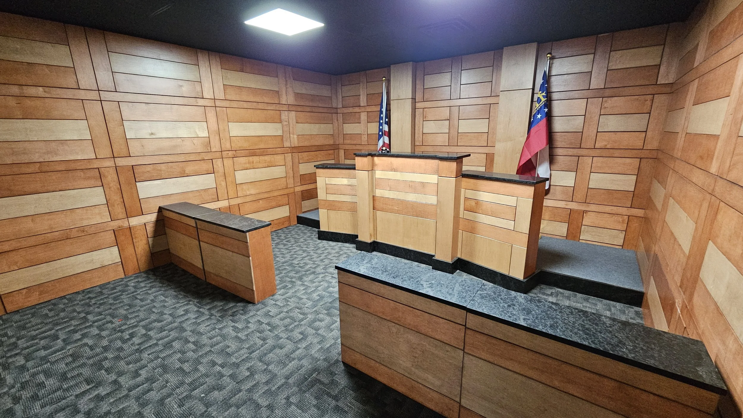 Realistic 14×14 courtroom set with wood-paneled walls and raised judge’s bench