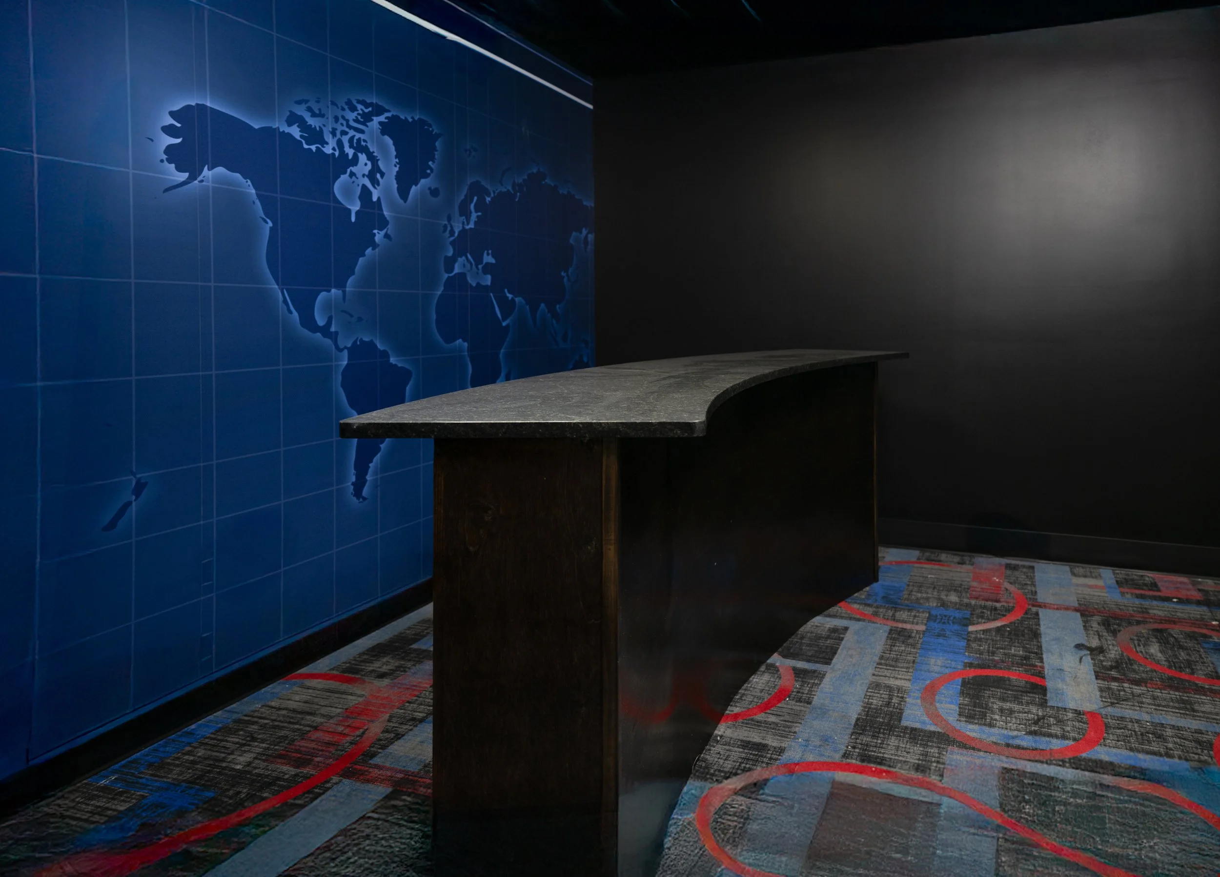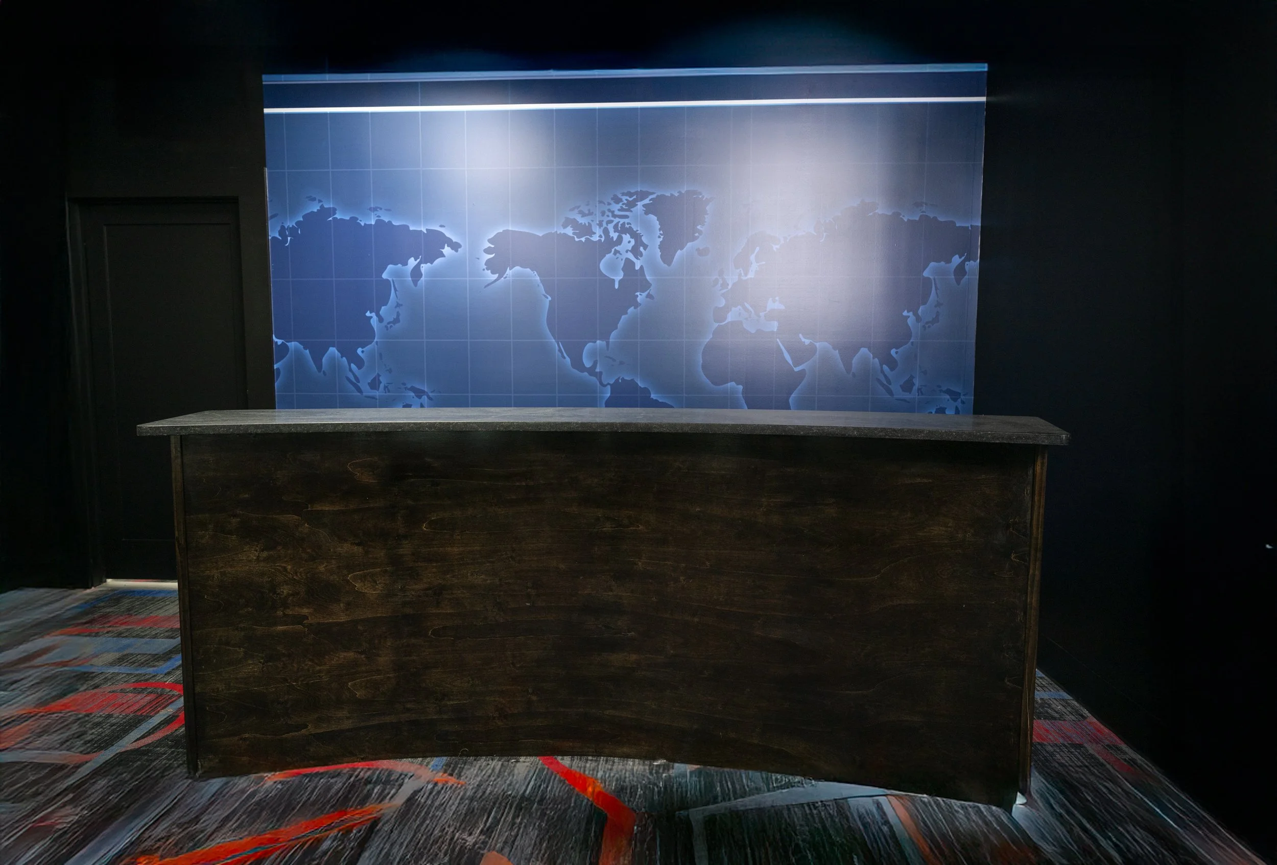 Our 14×14 Newsroom Studio recreates the polished look of a professional broadcast set, designed for anchors, interviews, and on-camera announcements. The space features a curved news desk positioned in front of a large world map backdrop, creating a classic newsroom aesthetic that instantly reads as broadcast-ready on camera.